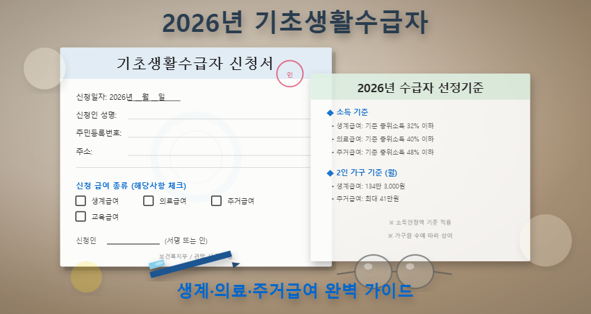 이 글은 2026년 기준 중위소득 및 선정기준을 바탕으로 작성되었으며, 개별 상황에 따라 실제 지급액은 달라질 수 있습니다. 정확한 상담은 거주지 주민센터 복지과에 문의하시기 바랍니다.