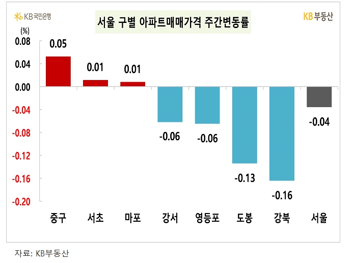 KB부동산이 발표한 주간KB아파트시장동향 자료에 따르면 전국 아파트 매매는 -0.04%로 하락했고, 전세는 0.05% 상승을 보였다. 서울 아파트 매매는 -0.04%로 하락, 전세는 0.11%로 상승을 유지하고 있다. 경기도는 전주 대비 매매 -0.03%로 하락, 전세는 0.07% 상승했다. 수도권 매매는 -0.03%로 하락을 기록했다. 서울의 매수우위지수는 여전히 매수문의보다는 매도 의사가 높은 비중을 보인 29.7을 기록했다.