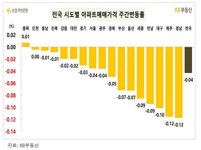 지역별 매매가격 변동률을 살펴보면, 인천을 제외한 5개 광역시(-0.07%)는 하락을 기록했다. 광역시 이외의 기타 지방 매매가격은 -0.05% 하락을 보였고, 지역별로는 충북(0.01%)만 미미하게 상승, 충남(-0.01%), 전북(-0.01%), 강원(-0.02%), 경북(-0.05%), 세종(-0.09%), 전남(-0.09%), 경남(-0.12%)은 하락했다.